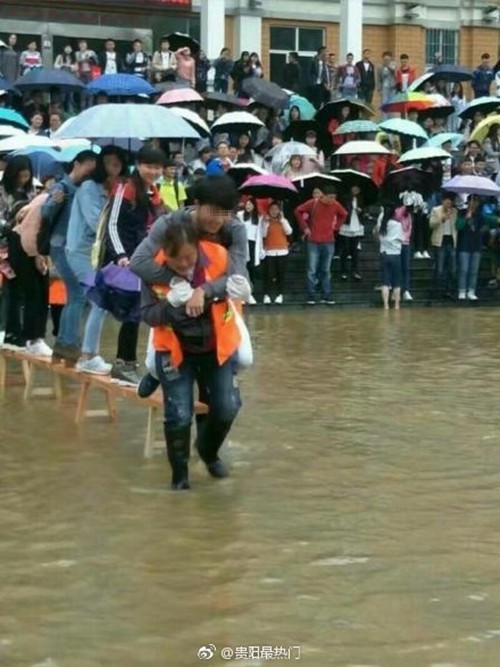 六盘水师范学院后勤处负责人谌曦表示,当时事发紧急,学生都着急上课,对于保洁阿姨提出来要背他们的时候学生都不太好意思。“虽然孩子们都二十多岁了,但是都马上要上课,湿了鞋子也不舒服,于是保洁人员做出了这样一个很有正能量的举动”。